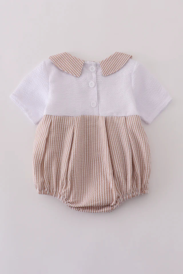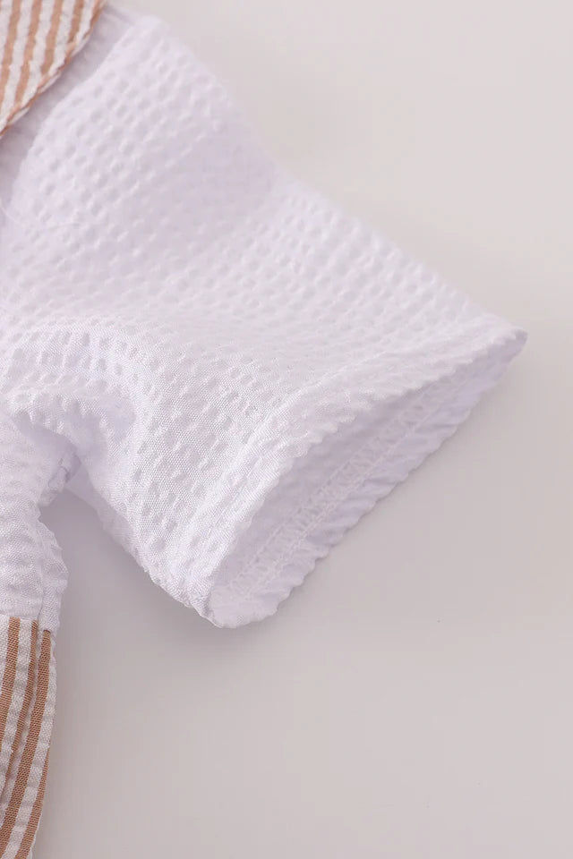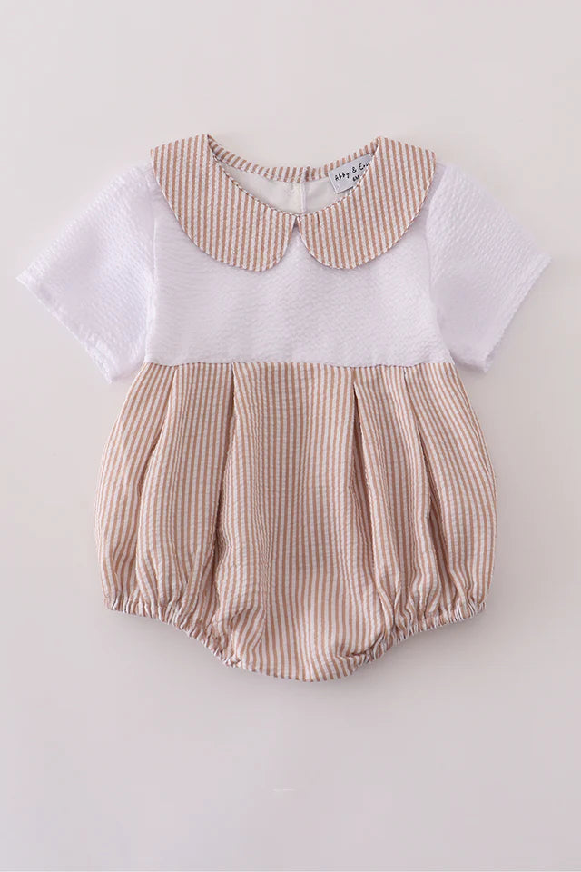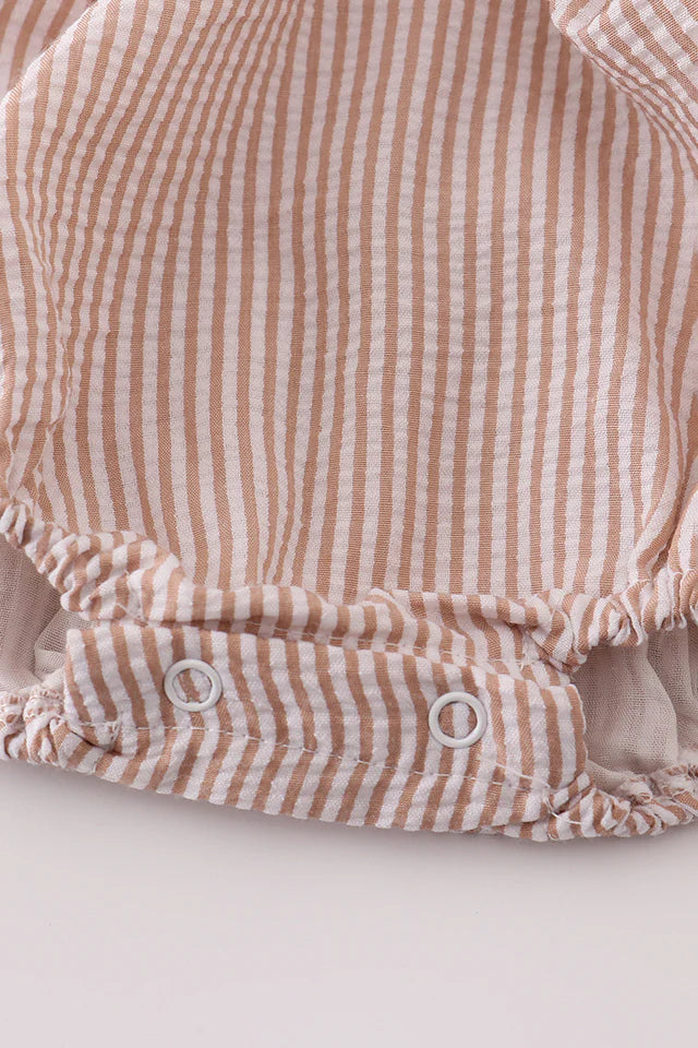 Wrap your little one in summer-ready charm with our Coastal Seersucker Boy Bubble! Featuring a classic brown and white stripe pattern in lightweight, puckered seersucker fabric, this bubble keeps things cool, comfy, and oh-so-cute. The timeless design and breezy silhouette make it perfect for sunny day outings, milestone moments, or simply stealing the show at playtime.