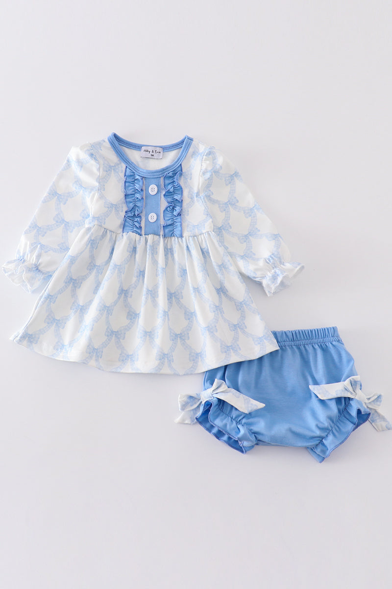Delicate, playful, and full of charm—this darling bloomer set is a sweet staple for any little wardrobe. Featuring soft watercolor-inspired bow details and fluttery ruffles, it's the perfect blend of whimsy and comfort. Whether she’s twirling through a family picnic or giggling during playtime, this set brings effortless style to every occasion.