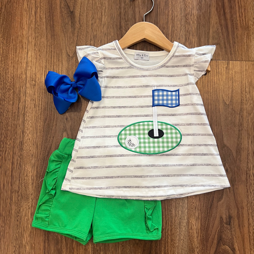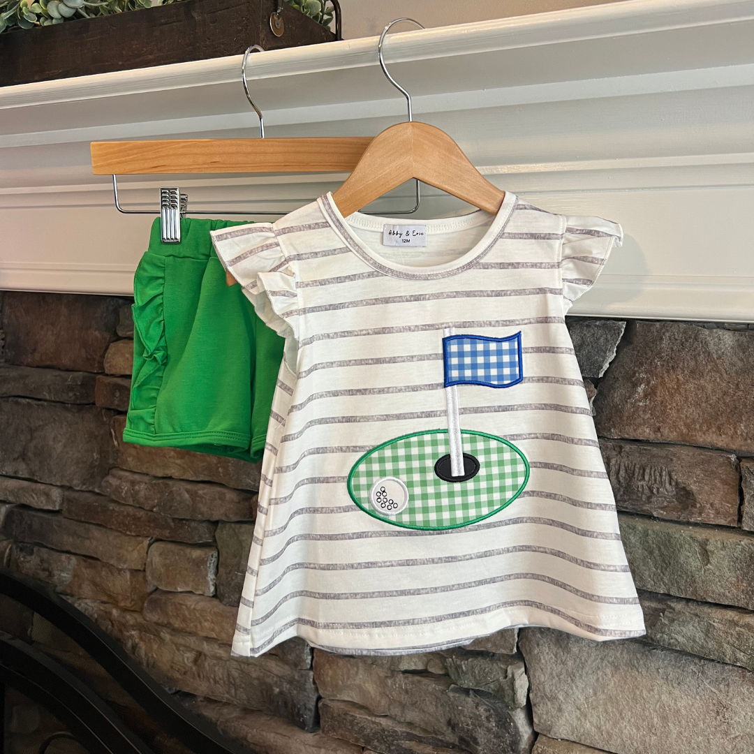 Tee up some cuteness with our Cutie on the Green Set! This playful two-piece features a sporty golf appliqué on a soft, stretch-kissed top with coordinating comfy pants—perfect for your little one’s day out, whether she’s tagging along to the course or just swinging by the sandbox. A fun, fresh look for your mini golfer-in-the-making. 💗⛳