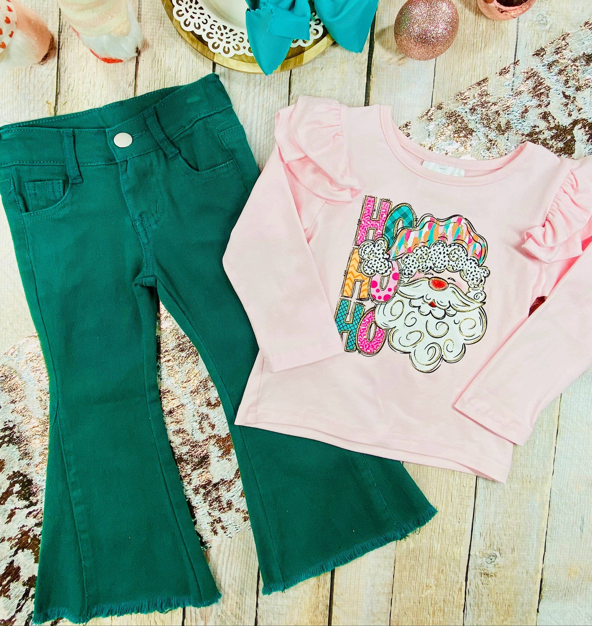 This festive two-piece features a playful “Ho Ho Ho” Santa top paired with green plaid bell bottoms for the perfect mix of merry and modern. Made from soft, stretchy fabric, it’s comfy enough for school parties, Christmas photos, and cozy family celebrations. A fun and festive favorite she’ll want to wear all season long!