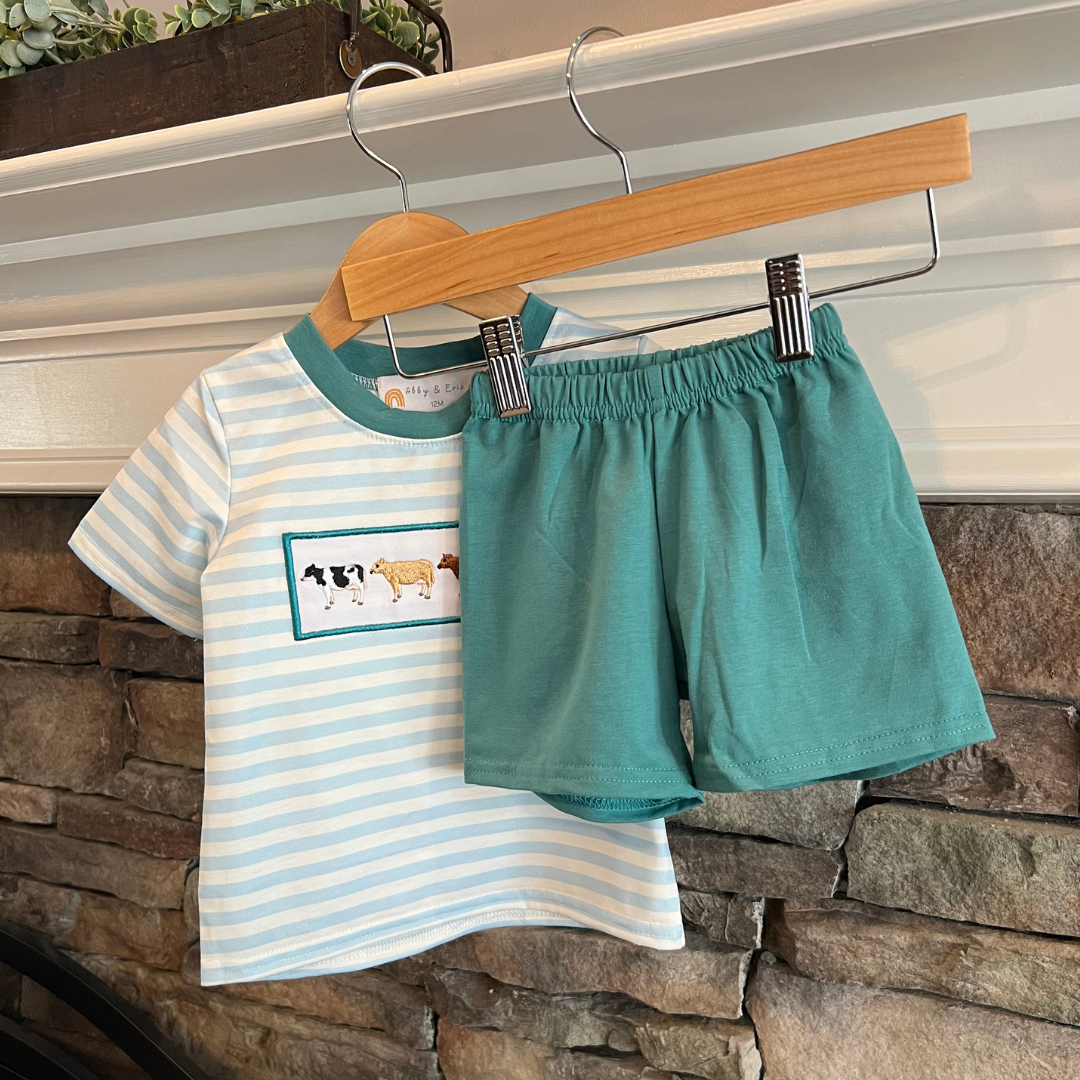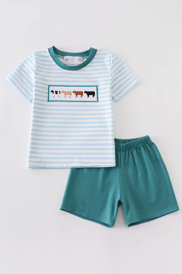 Round up the cuteness with our Moo Crew Set! 🐄💙 This playful outfit features a cool cow embroidery and classic blue stripes that’ll have your little cowboy looking ranch-ready in no time. Comfy enough for playtime, picture day, or a trip to the farm—this set is udderly adorable!