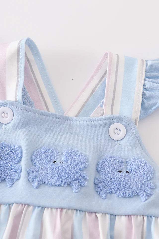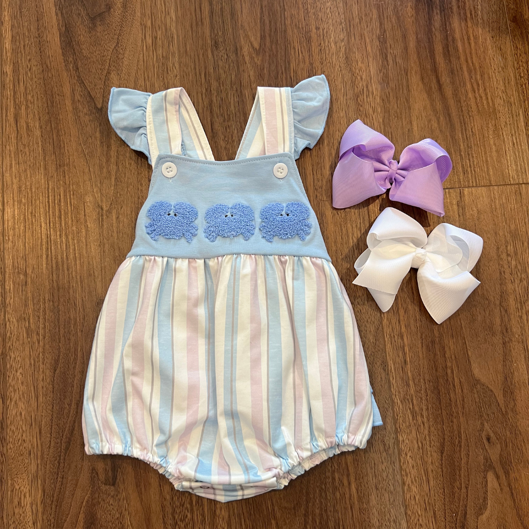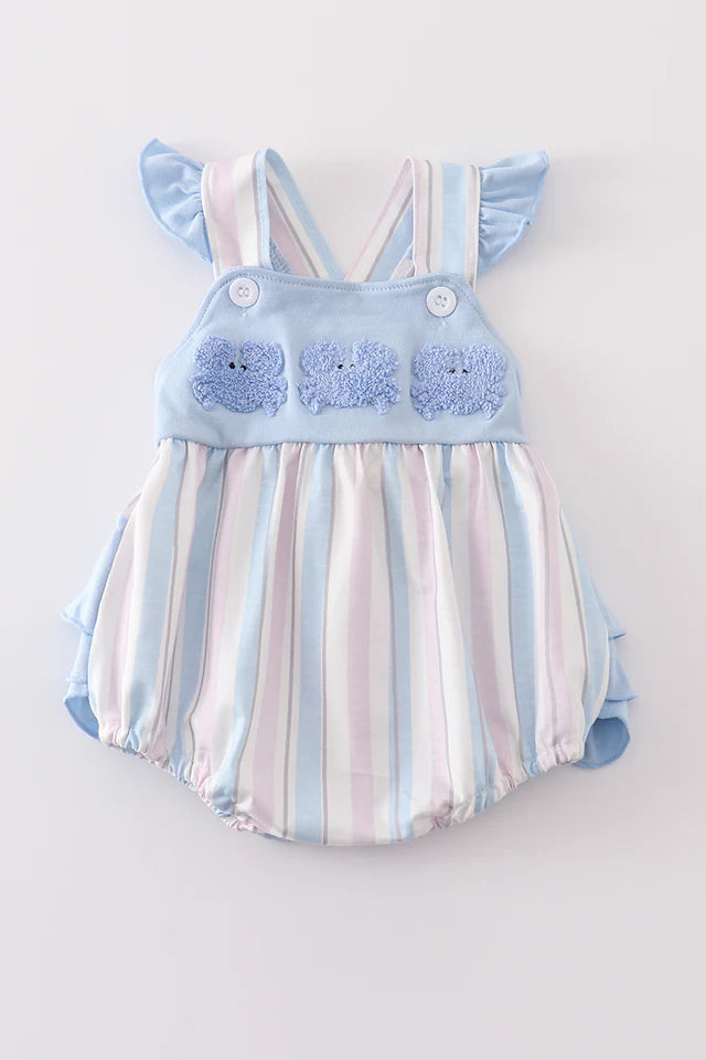 Your little beach babe will steal the spotlight in our Shoreline Snappers Bubble! Featuring a charming crab design with delicate French knot details, this sweet striped bubble brings seaside style to any summer day. Whether she’s chasing waves or soaking up the sun, this comfy-cute outfit is a splash hit! 🦀💖🌊